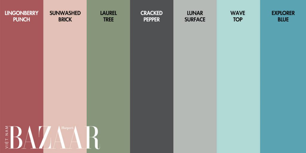 Những gam màu có tính tương phản giúp gây kích thích ánh nhìn, tạo năng lượng cho gia chủ. Đó là đỏ dâu Lingonberry Punch, xanh ngọc Wave Top, xanh đại dương Explorer Blue, xanh lá Laurel Tree. Để giúp không gian trông đằm thắm, bạn sẽ kết hợp chúng với những tông trung tính như xám đậm Cracked Pepper, xám nhạt Lunar Surface hay hồng đất Sunwashed Brick.