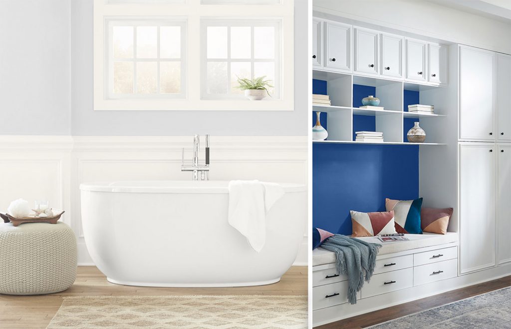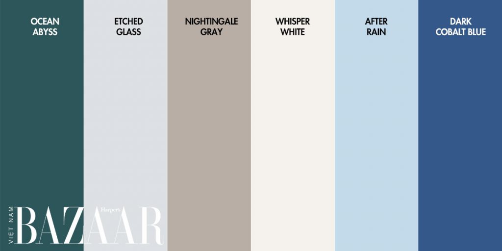 Các mã màu cho bạn từ hãng sơn Behr bao gồm xanh biển sâu Ocean Abyss, xanh cobalt – cũng từng là màu của năm 2020, các tông lam nhạt, beige và xám.