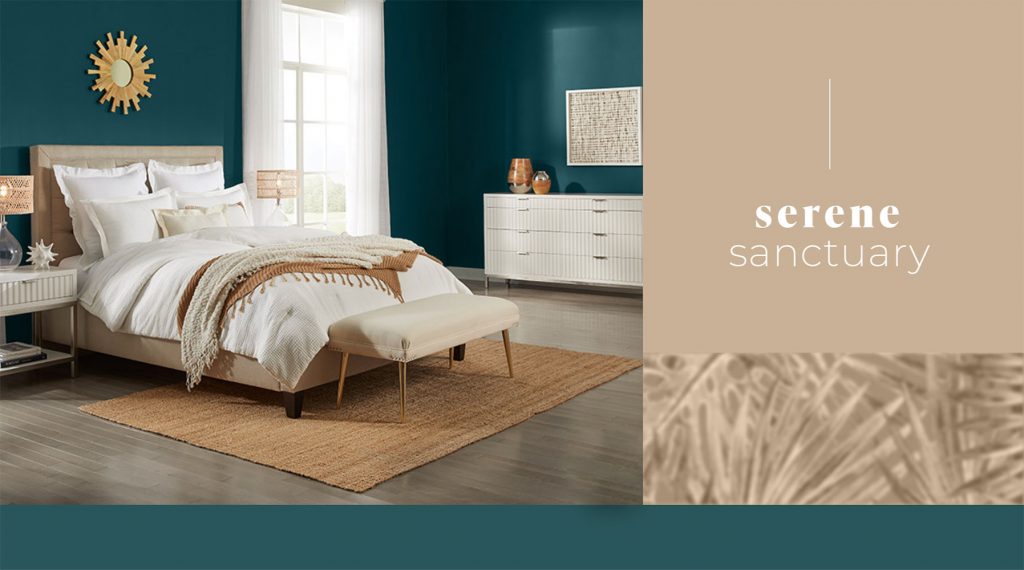 Màu xanh đậm Ocean Abyss phù hợp cho phòng ngủ tối, giúp bạn ngủ ngon hơn. Kết hợp cùng màu beige để tạo điểm nhấn hoà nhã.