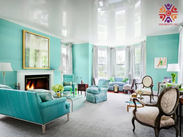 Bạn có thể sử dụng màu xanh ngọc để sơn phòng khách kết hợp với rèm cửa màu trắng giúp mở rộng tối đa không gian.